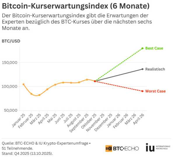 Together with Prof. Dr. David Florysiak of IU International University, BTC-ECHO conducted a crypto expert survey, the results of which were published in the BTC-ECHO Insider Report. When asked what Bitcoin price crypto experts from the DACH region predict in the next six months (until April 2026), the following results emerged.