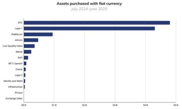A look at so-called fiat onramping, the exchange of traditional fiat currencies such as US dollars or euros for digital assets, shows that Bitcoin is and remains the most important gateway to the crypto scene. Between July 2024 and June 2025, more than $4.6 trillion in fiat money flowed into BTC. This makes Bitcoin more than twice the volume of the next largest category, Layer 1 tokens excluding BTC and ETH, at $3.8 trillion. Stablecoins followed with $1.3 trillion, and altcoins with around $540 billion.