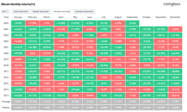 Against the backdrop of this data, a bullish baseline scenario emerges for October 2025. Historically, the average return in October is around 20 percent positive – if this were to prove true, Bitcoin would rise to around $135,000 by the end of the month. Even an increase in this range would mark a new all-time high and confirm the uptrend.