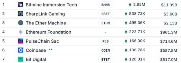 - Bit Digital, the former Bitcoin mining company, is currently one of the largest Ethereum treasuries: With 120,310 ETH, valued at approximately $517 million, the company ranks seventh in the global rankings. The company's stock is trading at approximately $3.15, having gained 21.32 percent in one month.