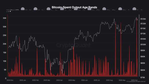 Gemäß der On-Chain-Analyse von CryptoQuant wurden am 7. Oktober 34.300 Bitcoin im Wert von insgesamt 4,15 Milliarden Dollar über die Blockchain verschoben – aus Wallets, die zuvor zwischen drei und fünf Jahren inaktiv gewesen waren. Dies ist die umfangreichste Bewegung des Jahres und fiel mit einem kurzzeitigen Preisrückgang von etwa 125.000 Dollar auf 120.000 Dollar zusammen.