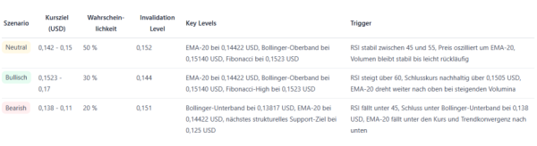 Der Kurs notiert über dem 20-Tage-EMA (0,1442 USD), ein kurzfristig positives Signal. Nach dem Tiefstand bei 0,1418 USD hat sich eine Reihe höherer Hochs und Tiefs gebildet, was eine Erholung nahelegt. Wesentliche Unterstützungsniveaus liegen bei 0,144 USD (20-Tage-EMA / Bollinger Band) und 0,138 USD (Unteres Bollinger Band). Widerstandsniveaus finden sich bei 0,1505 USD und 0,1523 USD (Fibonacci-Retracement). Solange der Kurs oberhalb des EMA verbleibt, bleibt die kurzfristige Perspektive optimistisch.