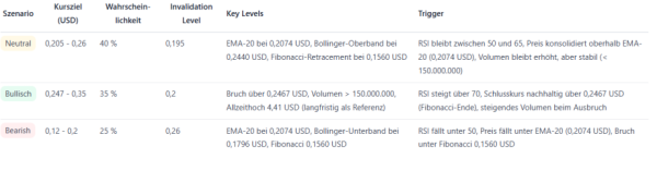 The value is still being traded above the 20-day EMA at $0.2074, sustaining its near-term bullish pattern with successive higher peaks and troughs. Crucial support thresholds are situated at $0.2074 and $0.1856, whereas the immediate resistance resides within the $0.2393 to $0.2467 spectrum. Provided the price remains over the 20-day EMA, the configuration intimates a sustained optimistic direction.