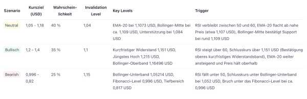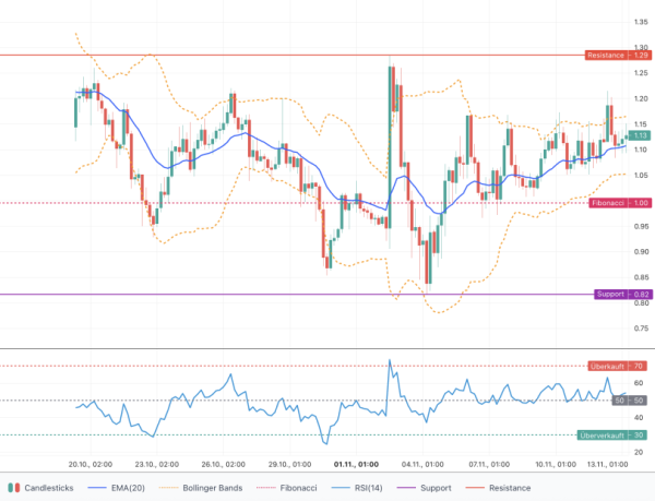 Die Bollinger Band Breite beträgt derzeit etwa 0,113 USD (oberes Band 1,16496 USD / unteres Band 1,05214 USD), was auf mäßige, aber vorhandene Schwankungen hindeutet. Marktphase: Konsolidierung mit leicht erhöhtem Risiko, solange sich der Kurs in der Nähe des oberen Bandes befindet.