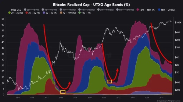 He pointed to the actions of long-term Bitcoin holders. When the growth cycle approaches its peak, this group of investors begins actively selling the asset—especially coins held for more than a year. Now, a different picture is being observed: the share of “older” coins is gradually declining, hinting at a new growth momentum.