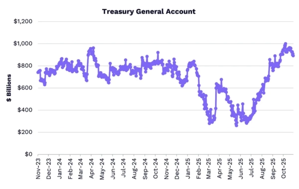 The Treasury's account remains at a high level of $892 billion against the normalized level of ~$600 billion.