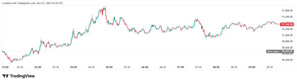On the night of November 27, 2025, Bitcoin experienced positive momentum, reaching $91,942, according to TradingView. Experts believe the upward trend is fueled by expectations of an interest rate cut by the US Federal Reserve (Fed).