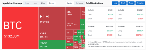 The sharp uptrend has impacted traders' short positions. The total daily liquidation volume on the futures market is over $318 million, with short positions dominating.