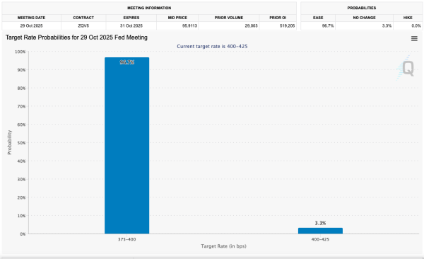 According to the Chicago Mercantile Exchange (CME Group), the market is almost unanimously expecting them to decline by 0.25% on October 29.
