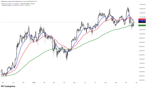 BTC/USD daily chart with 21-, 55-, and 200-period EMAs. Source: Caleb Franzen/X.