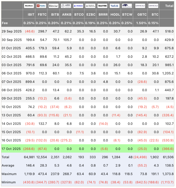 Eleven U.S. spot Bitcoin ETFs saw a combined outflow of $366.6 million on October 17, capping a disastrous week for institutional Bitcoin investment products.