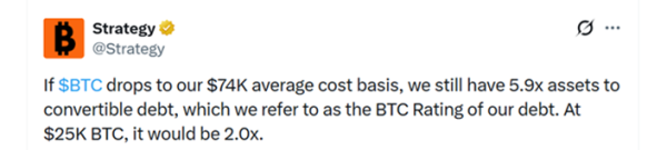 Strategy reported maintaining solvency even if the stock price falls to $25,000. In this case, assets would more than double the convertible debt. At $75,000, this metric would drop to 5.9x.