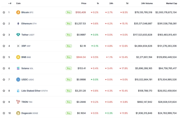 Bitcoin has fallen 2.9% in the past 24 hours and 8.9% over the past week. At the time of writing, the coin is trading at $100,110.
