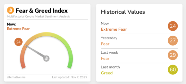 The cryptocurrency Fear and Greed Index is at 24, the “extreme fear” zone.