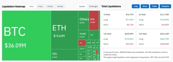Amid the correction over the past hour, positions worth $76.8 million were liquidated. The 24-hour figure reached $674.3 million.