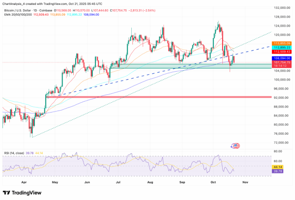 The 200-day EMA at $108,000 also became the limit after a failed rebound. The Relative Strength Index (RSI) is near 39, confirming weak momentum and leaving a downside risk if buyers fail to hold this zone.