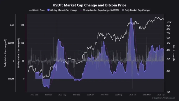 The decrease in the ratio indicates an increase in the purchasing power of stablecoins, which is confirmed by growing liquidity—the issuance of more than 10 billion USDT over the past 60 days.