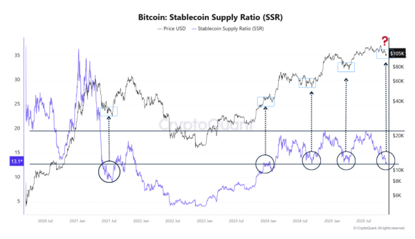 The stablecoin supply ratio (SSR) has fallen back to the “low historical zone (13) – the same one that marked the bottom in mid-2021 and throughout 2024,” the analyst noted.