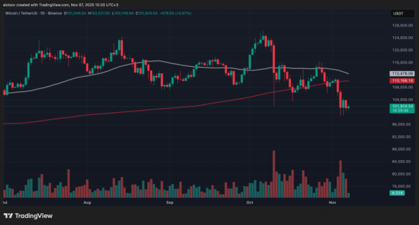 Bitcoin fell to $100,300 on November 6, losing 2.5% in a day along with U.S. stocks amid disappointing macroeconomic data. The leading cryptocurrency is trading around $101,924, following the S&P 500 and Nasdaq 100 indices, which also fell.
