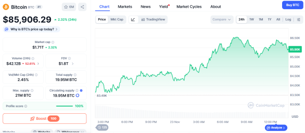 On November 23, Bitcoin (BTC) tested levels above $86,000. Its daily peak was $86,547. By the time of writing, the coin had corrected to $85,843.