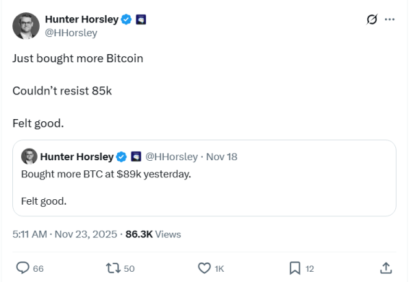 Bitwise CEO Hunter Horsley, meanwhile, told X that he “bought even more BTC.” He added that he couldn't resist the $85,000 price, and that “it felt good.”