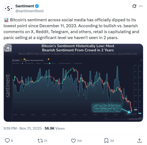 Bitcoin sentiment on social media has reached its lowest level since December 11, 2023. Santiment analyzed bullish and bearish comments from market participants on X, Reddit, Telegram, and other platforms.