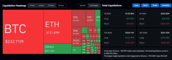 Over the past 24 hours, the volume of liquidations on the market reached $554 million, of which $358 million were short positions.