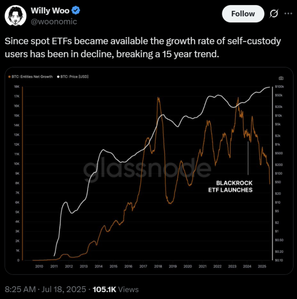 While spot ETFs and direct ownership don't directly compete, they appeal to different types of investors. Analyst Willy Woo noted back in July that demand for ETFs could have dampened interest in self-custody of cryptocurrencies.