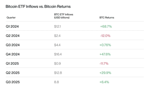Bitcoin ETF inflows and quarterly returns of the underlying asset. Source: Bitwise.