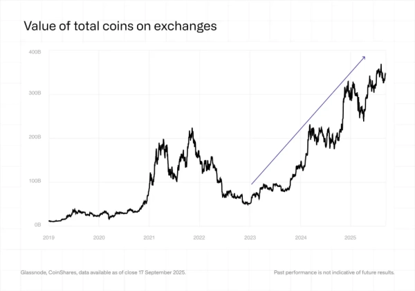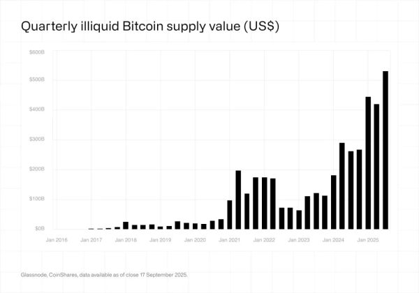 Bitcoin liquid supply price chart, quarterly. Source: CoinShares.