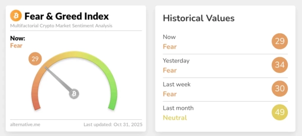The Fear and Greed Index is at 29, signaling a predominance of pessimism. The indicator has dropped five points in the past 24 hours.