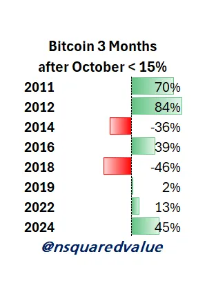 “Bitcoin's average three-month return after a weak October is 11%, and after a strong October, it's 21%,” he noted.