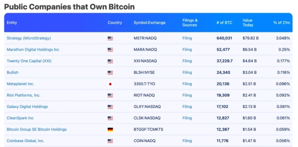 The top 10 largest Bitcoin holders among public companies. Source: BitBo.