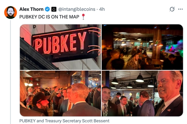 Bitcoin community members reacted enthusiastically Thursday to the unannounced appearance of US Treasury Secretary Scott Bessent at the opening of the new Pubkey-themed bar in Washington.