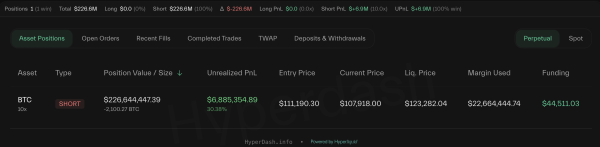 According to the latest Hyperdash data, this investor's active short Bitcoin position is valued at $226.6 million, with 10x leverage. The liquidation price is set at $123,282. Furthermore, the position currently shows an unrealized profit of approximately $6.8 million.