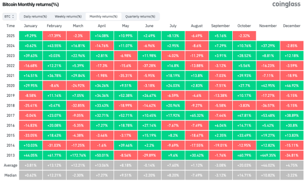 According to CoinGlass, BTC/USD is 2.3% below its September close.